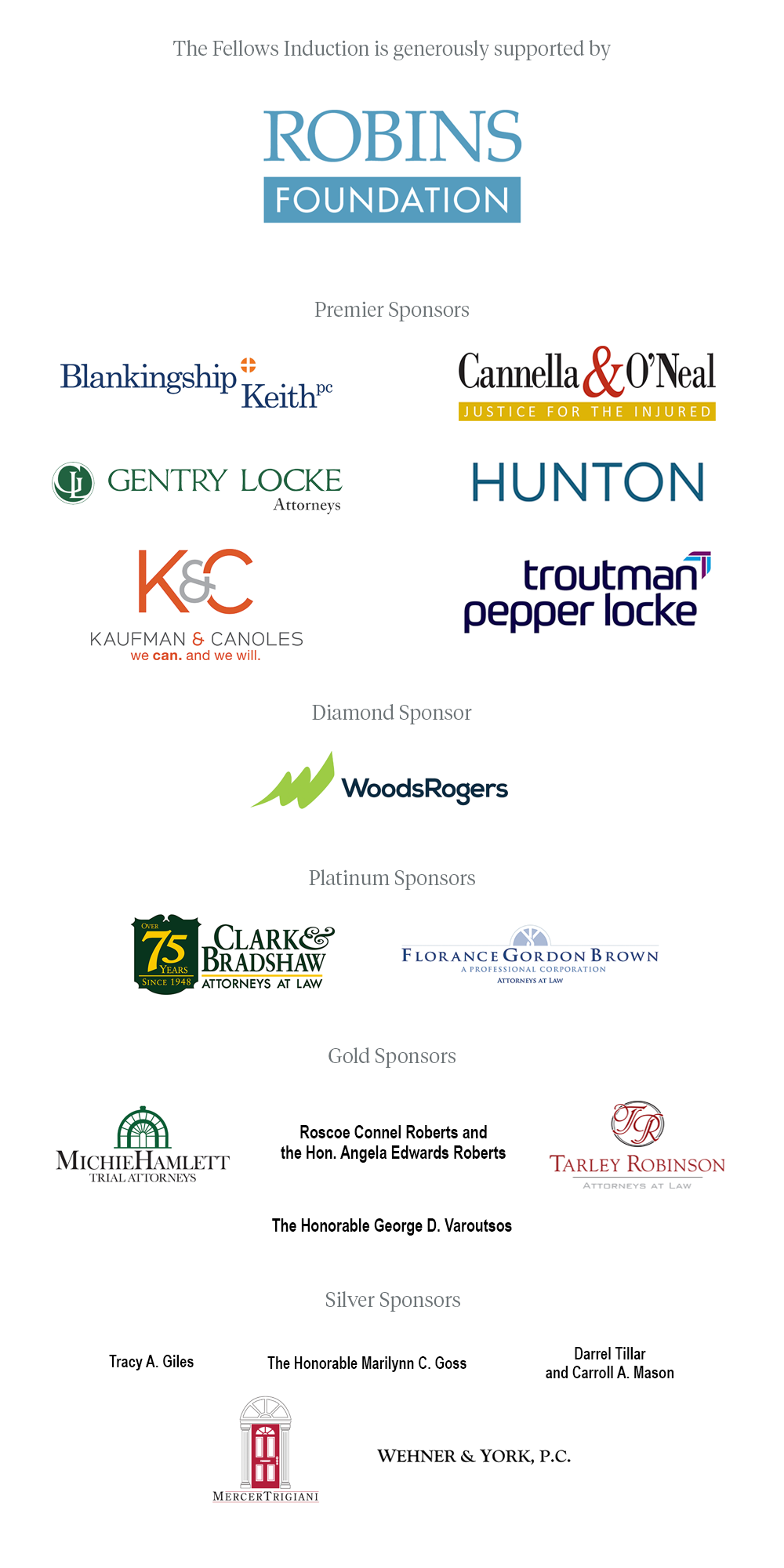 Sponsoring the 2026 Induction Celebration is a meaningful way to show the Fellows your gratitude and support for their dedication to the legal profession, their communities, and the Commonwealth of Virginia. Sponsorship levels range from $250 to $2,000. You can download a list of sponsor benefits here.